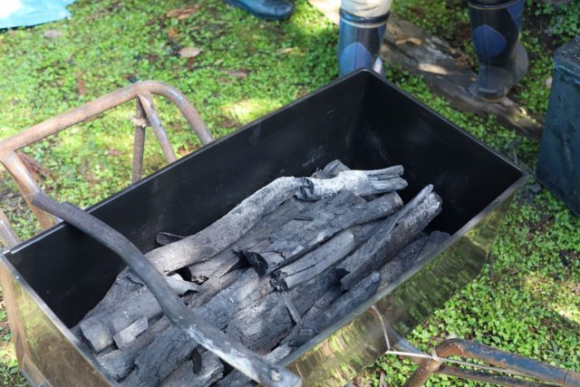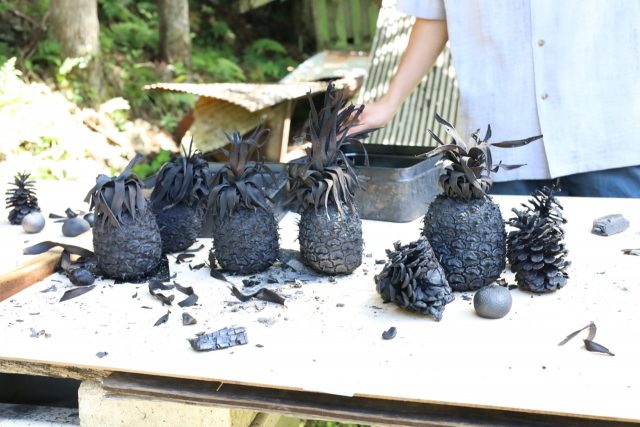 火入れ後、初お披露目のパイナップル、くり、みかん、松ぼっくりの炭が出てきて