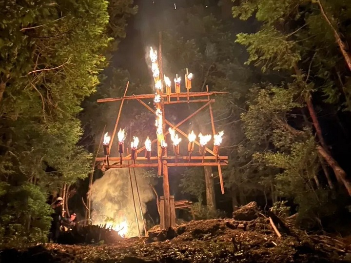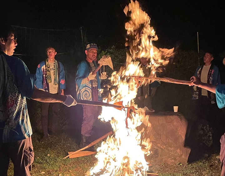 山で燃やした松明でスルメを焼いて、お寺で見ている方々にオモテナシ