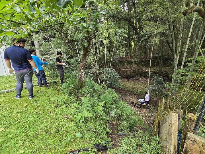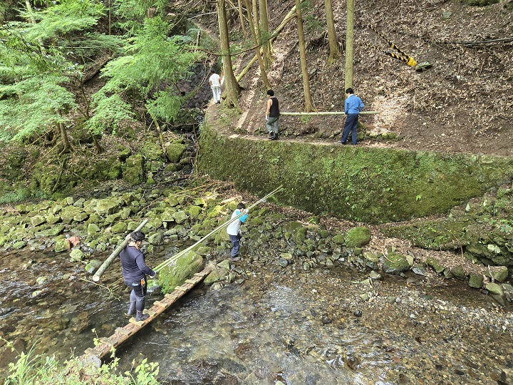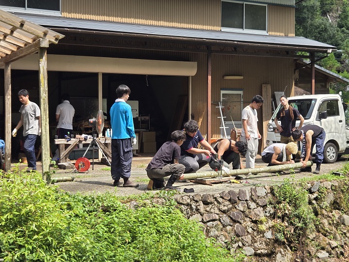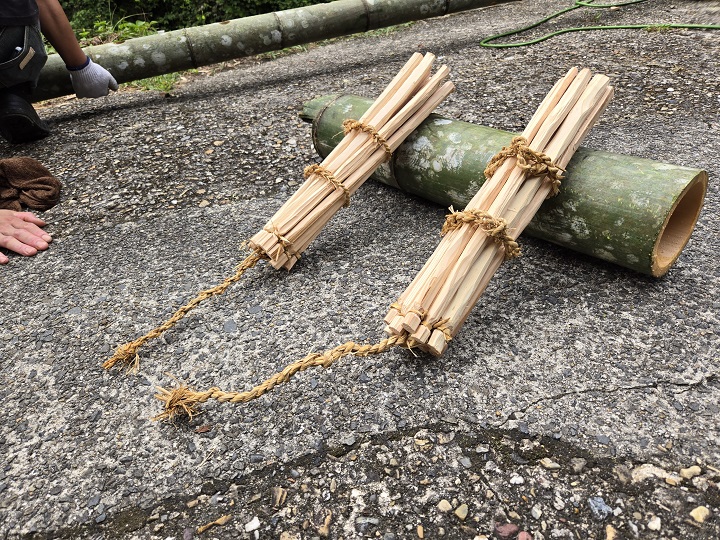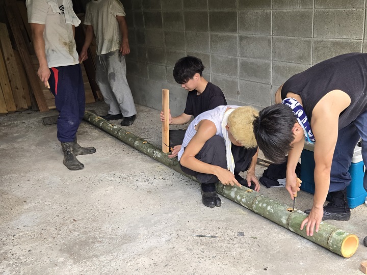 松上げの骨組みになる太い竹を切る者に分かれて作業。