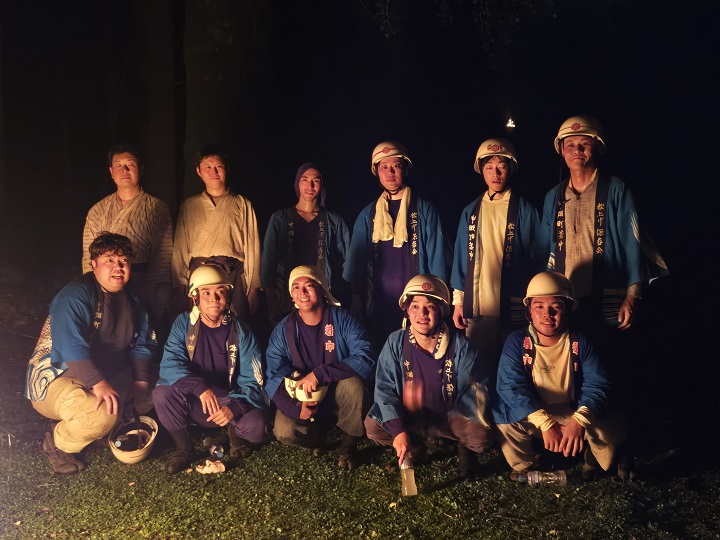 掛け声も勇ましく、若中たちが松明を手に帰ってきました。