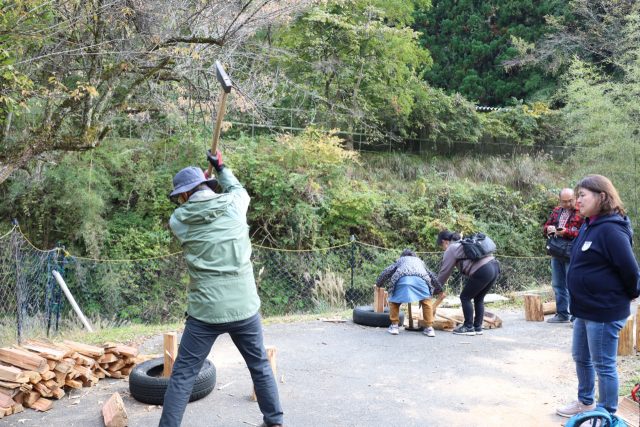 - たつじさん宅にて薪割り体験と、薪ストーブのあるログハウス見学