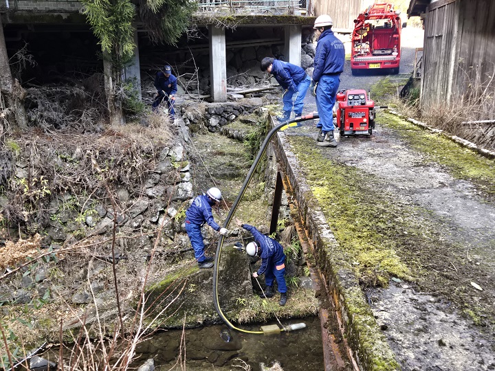 小型動力ポンプを使っての放水開始
