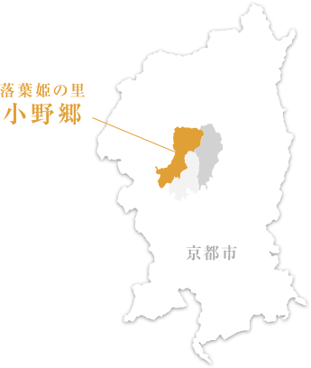 小野郷のいいところ・・・そういわれても、思いつかんなぁ。 まぁ、目の前に北山杉はあるし、川が流れて、蛍が飛んで、 畑があって、イチョウの黄葉がきれいで、歴史もけっこうあるな。 京都の街から近いのに、「きちんと田舎」。 そうそう、誰でもウェルカム、 誰でもすぐに「ふる郷」なとこはいいとこかなぁ。 きちんと田舎、行こうよ、小野郷。 落葉姫の里「小野郷」って?